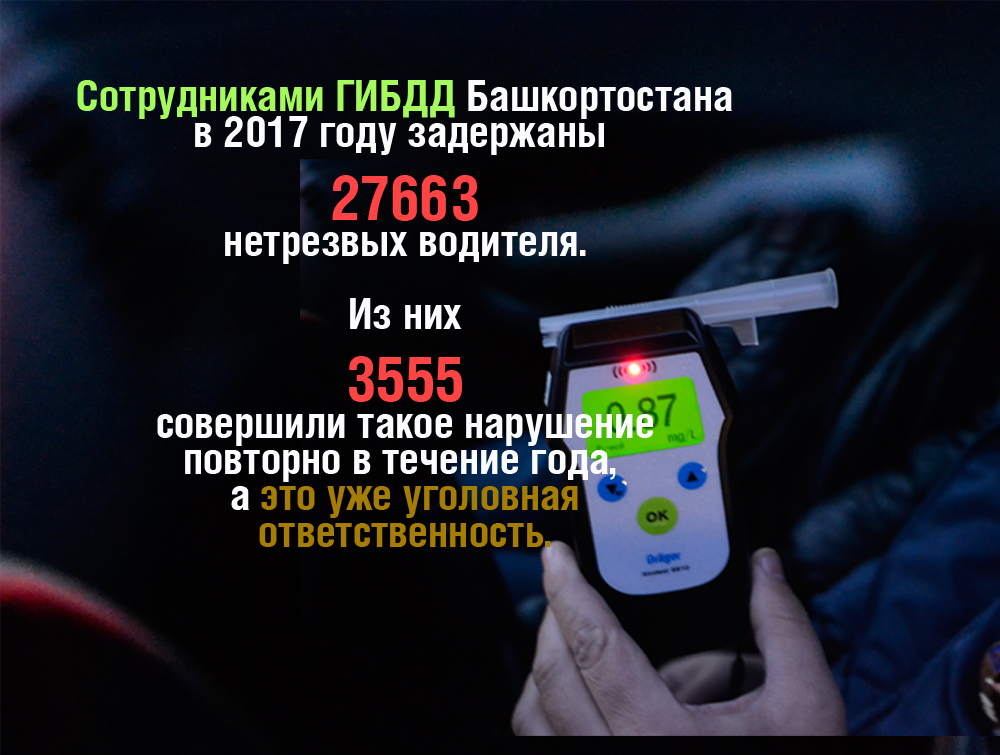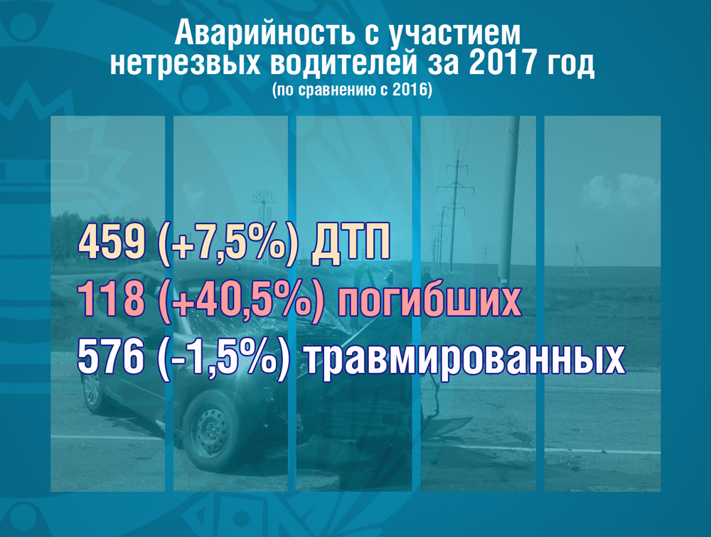 По итогам 2017 года выявлено 27 тысяч 663 факта управления транс-портными средствами водителями с признаками опьянения. Вместе с тем, число ДТП, совершенных в состоянии опьянения, возросло на 7,5% (всего 459), число погибших в них - на 40,5% (всего 118).