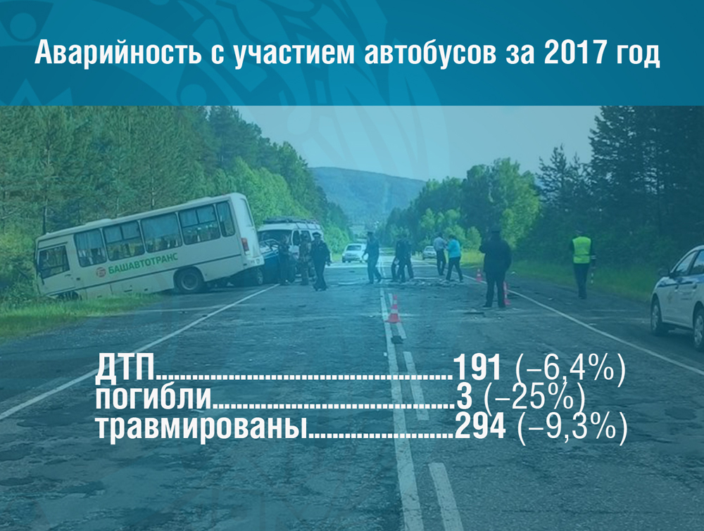 В 2017 году более 70 % от общего числа ДТП по вине водителей автобусов произошло на территории города Уфы. По республике пресечено более 167 тысяч нарушений ПДД водителями автобусов, в том числе задержаны 97 водителей за управление автобусами в состоянии опьянения, а также 40 водителей автобусов, лишенных права управления.