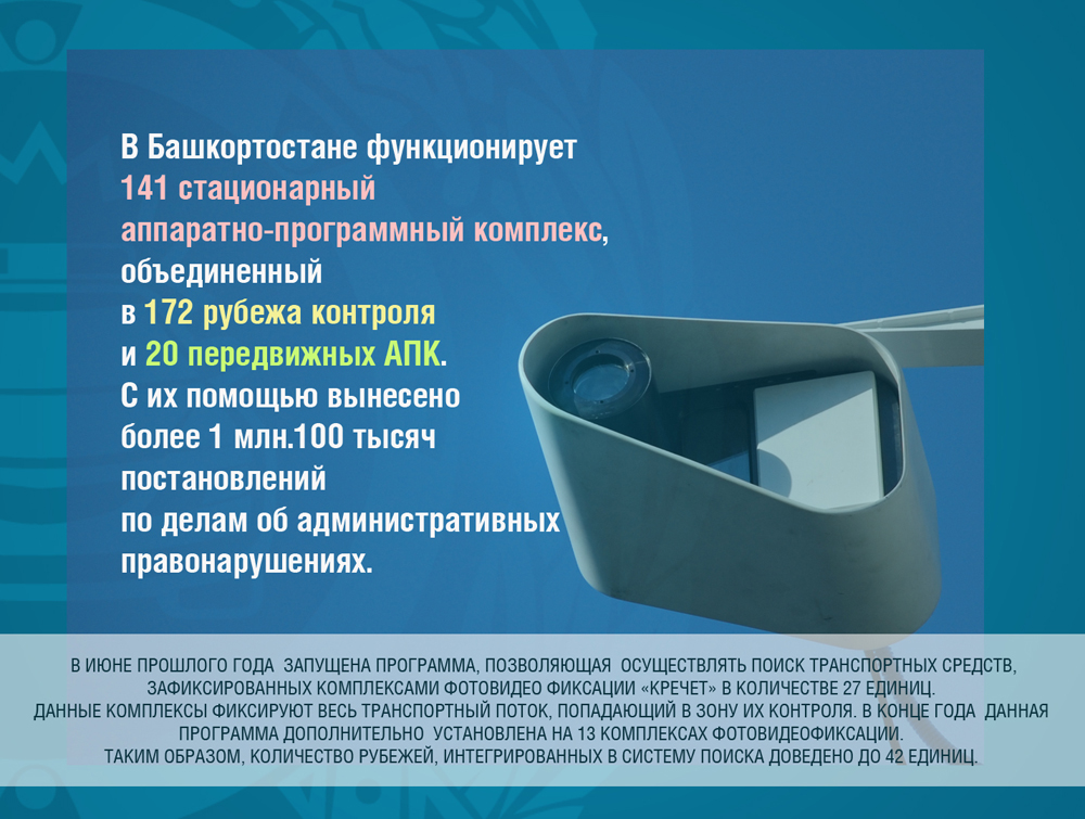 В июне прошлого года запущена программа, позволяющая осуществлять поиск транспортных средств зафиксированных комплексами фотовидео фиксации «Кречет» в количестве 27 единиц. Данные комплексы фиксируют весь транспортный поток, попадающий в зону их контроля. В конце года данная программа дополнительно установлена на 13 комплексах фотовидеофиксации. Таким образом, количество рубежей, интегрированных в систему поиска доведено до 42 ед.