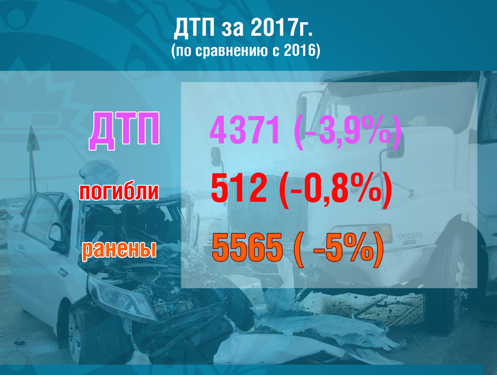 По итогам 2017 года достигнуто снижение количества ДТП на 3,9% (всего 4 тыс. 371), числа погибших - на 0,8% (всего 512) и раненых - на 5,0% (всего 5 тыс. 565).