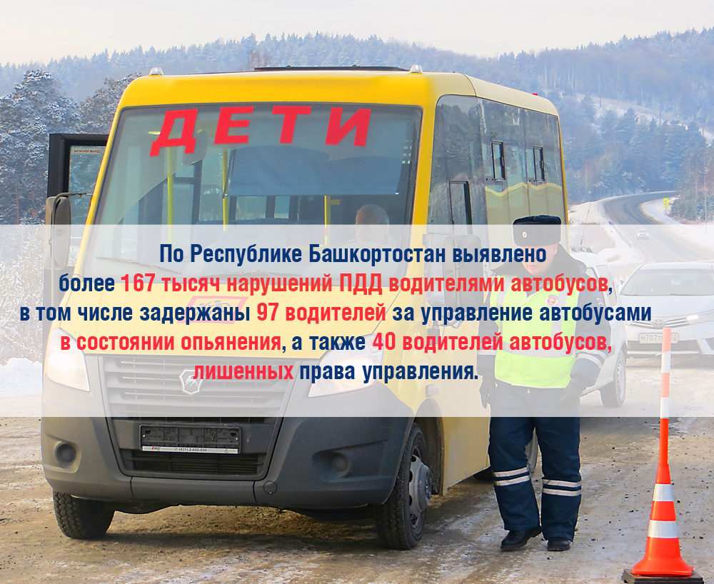 В 2017 году более 70 % от общего числа ДТП по вине водителей автобусов произошло на территории города Уфы. По республике пресечено более 167 тысяч нарушений ПДД водителями автобусов, в том числе задержаны 97 водителей за управление автобусами в состоянии опьянения, а также 40 водителей автобусов, лишенных права управления.