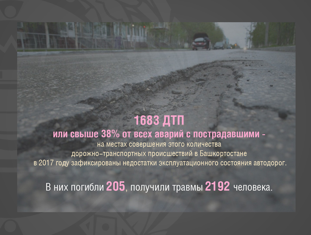 В истекшем году произошел прирост аварийности (+0,5%) в виду не-удовлетворительного содержания улично-дорожной сети, допущенного балансодержателями. В местах совершения свыше 38% дорожно-транспортных происшествий зафиксированы недостатки эксплуатационного состояния автодорог (всего 1683 ДТП).